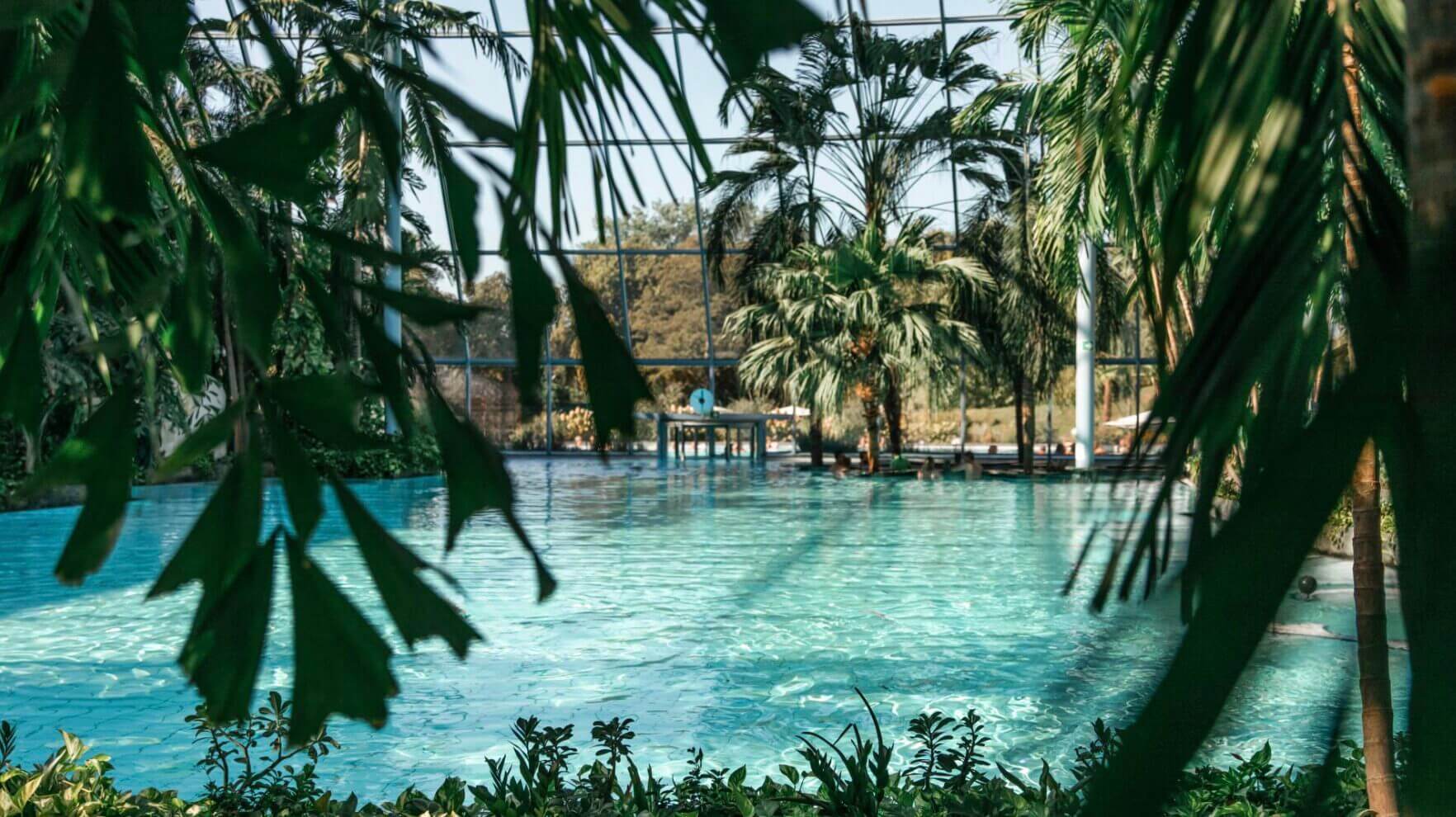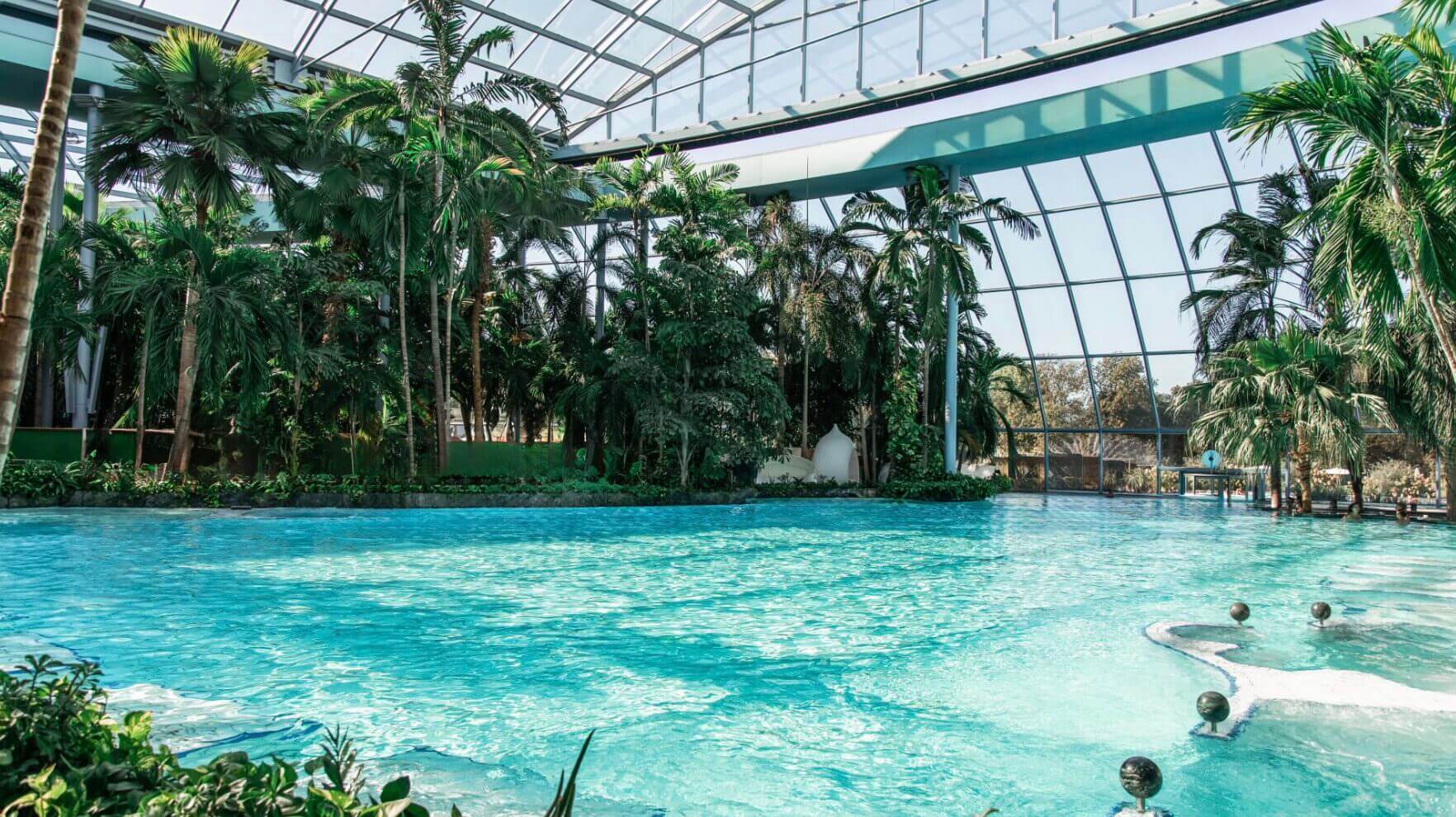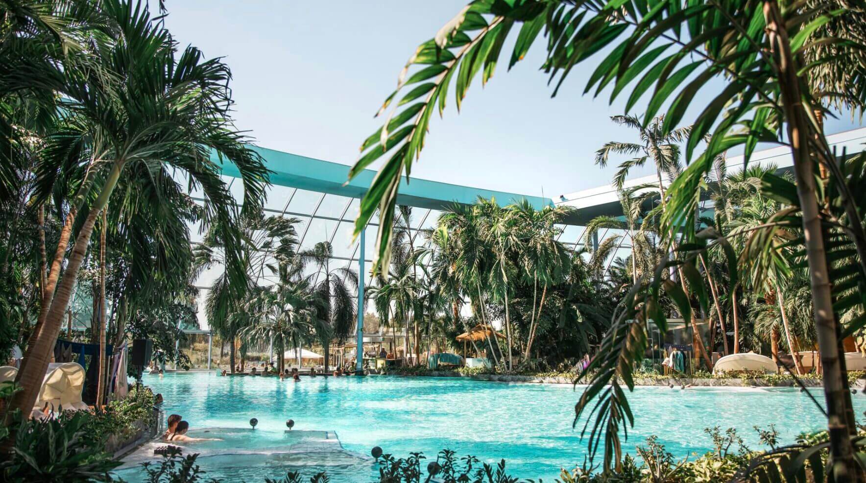 | 🏝️ Palmenparadies | 18.000 m² Karibik-Feeling mit 500 echten Palmen, türkisblauen Lagunen, Sprudelliegen, Whirlpools, zwei Poolbars und einem Panoramadach, das im Sommer geöffnet wird. |