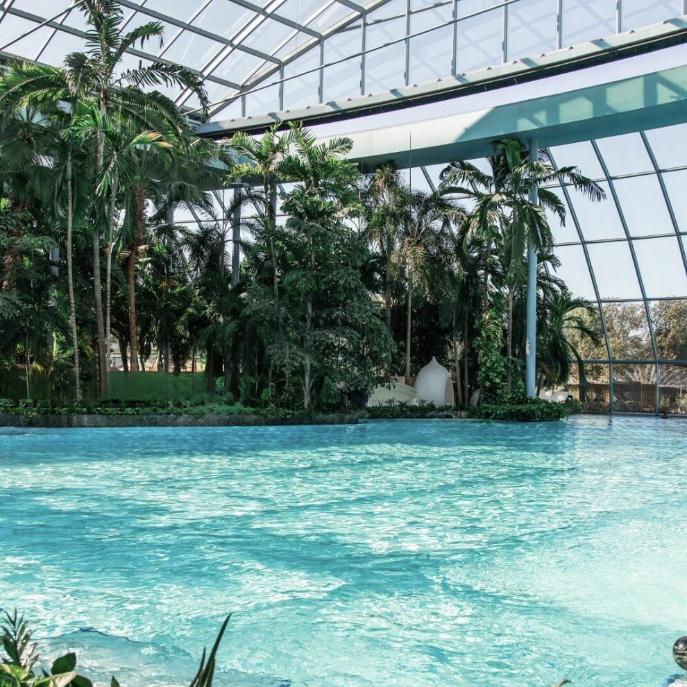 - Eine blaue Lagune im Innenbereich mit 500 echten Südseepalmen